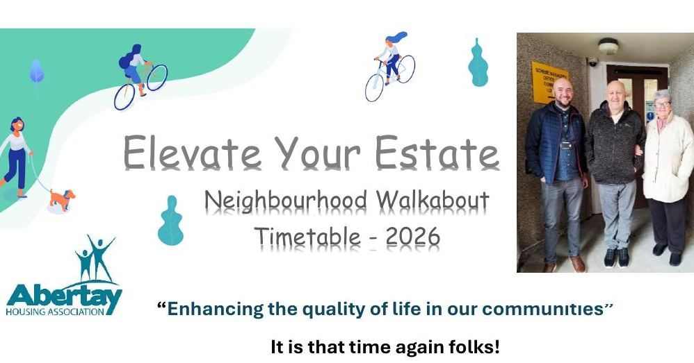 We would like to invite you to come along and join us on our regular Estate Walkabouts. This is your opportunity to have a say in how you would like to see your area improved. If you cannot come along on the day, you can still be involved. Contact us on 01382 903545 or alternatively email us at queries@abertayha.co.uk. You can highlight any improvements you think would enhance your estate and have influence in decisions we make in your community.