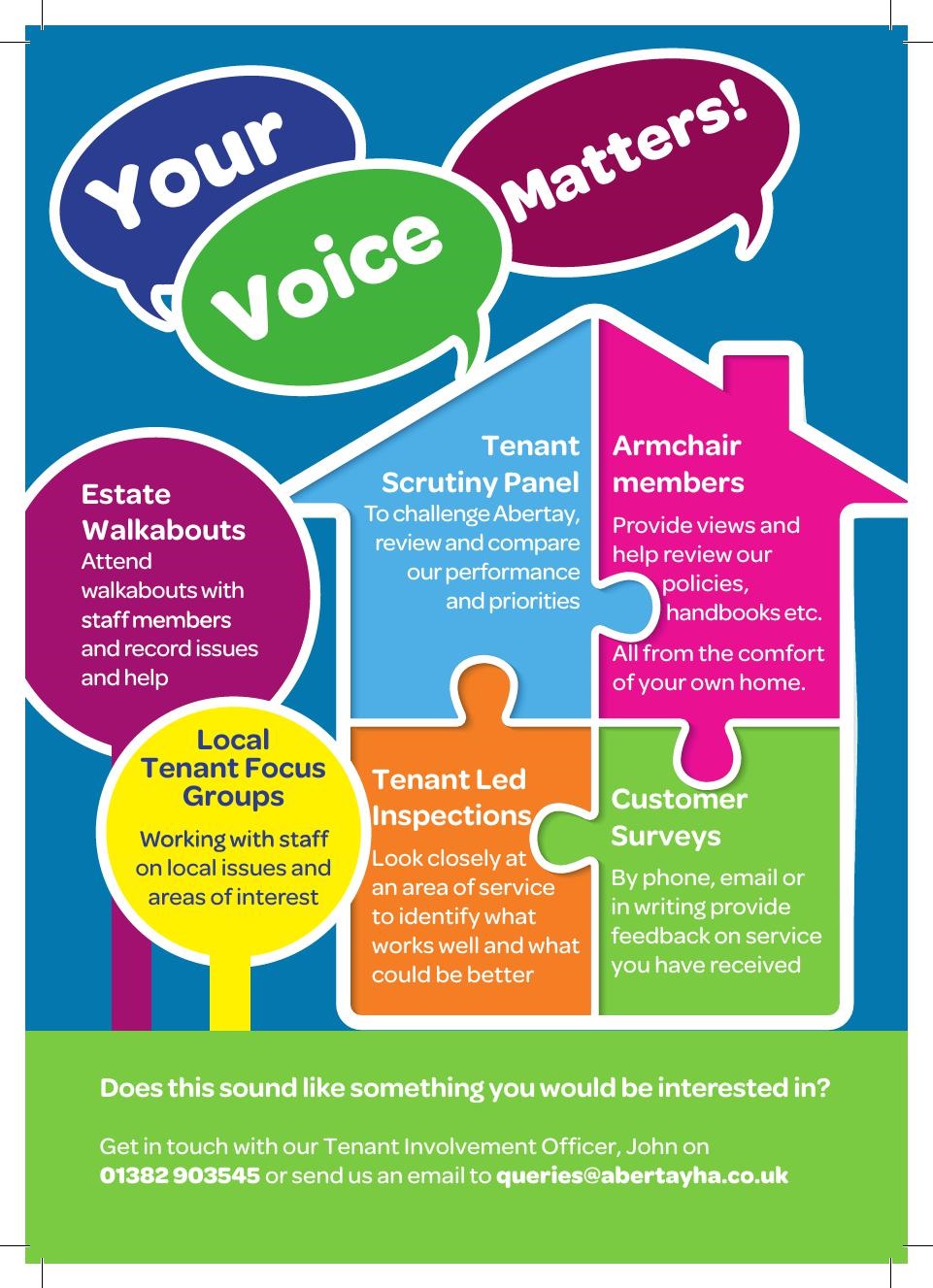 A Register of Interested Residents. If you do not want to be involved in a group but still want to be active in Abertay’s service provision, you can join our Register of Interested Residents. You will be contacted as part of consultation on policies and invited to various events. Participation is voluntary and confidential.